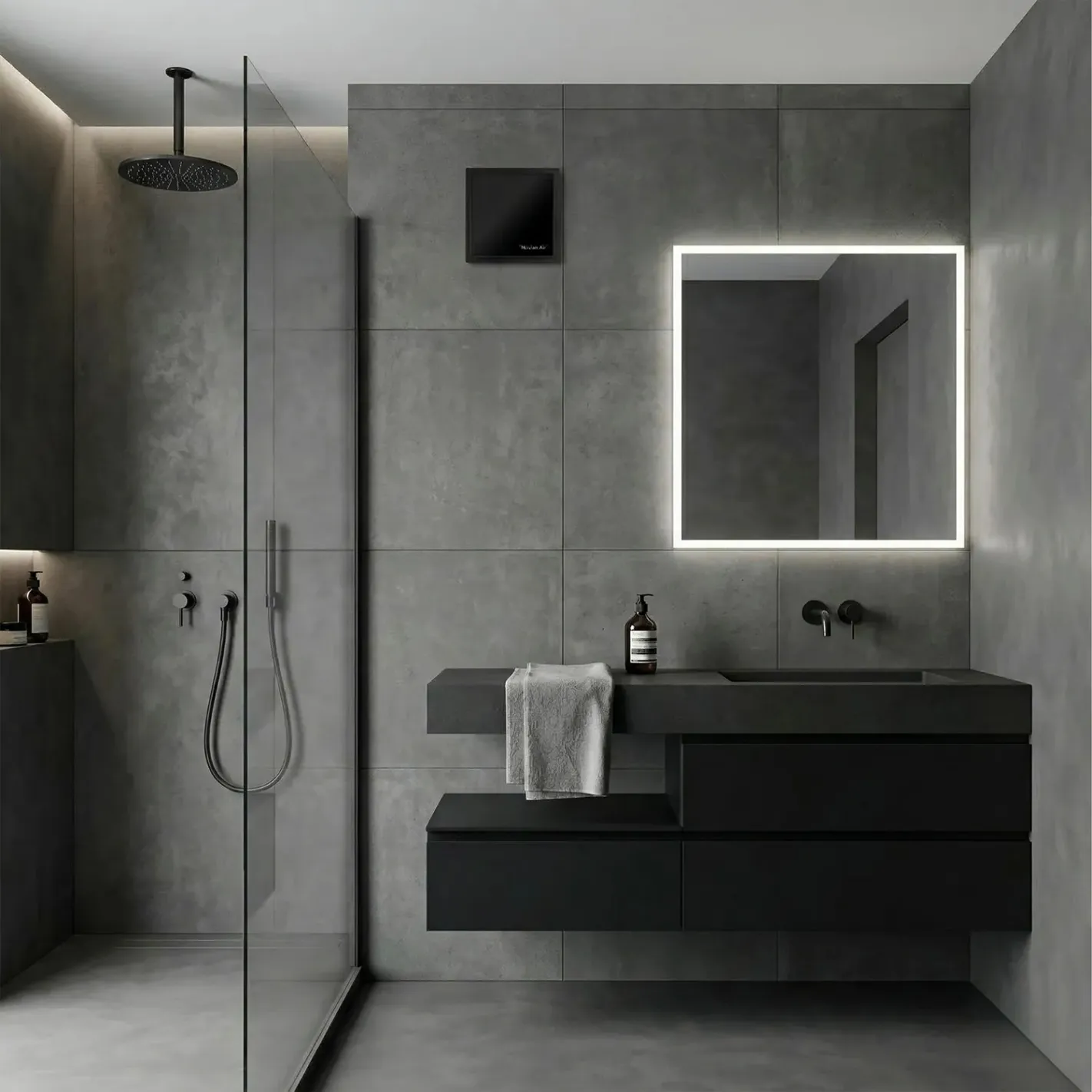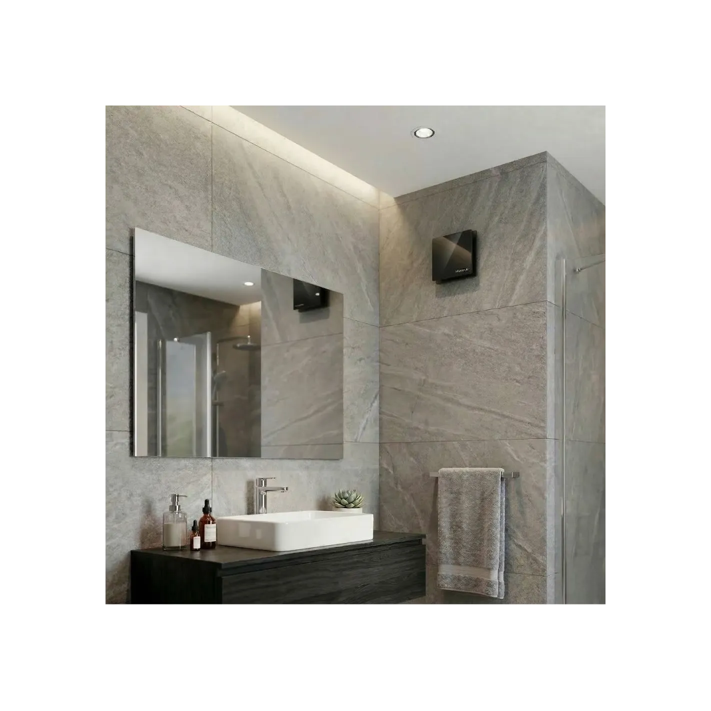 An efficient, exceptionally quiet bathroom fan designed for medium to larger rooms. The modern design fits seamlessly into dark, minimalist interiors.