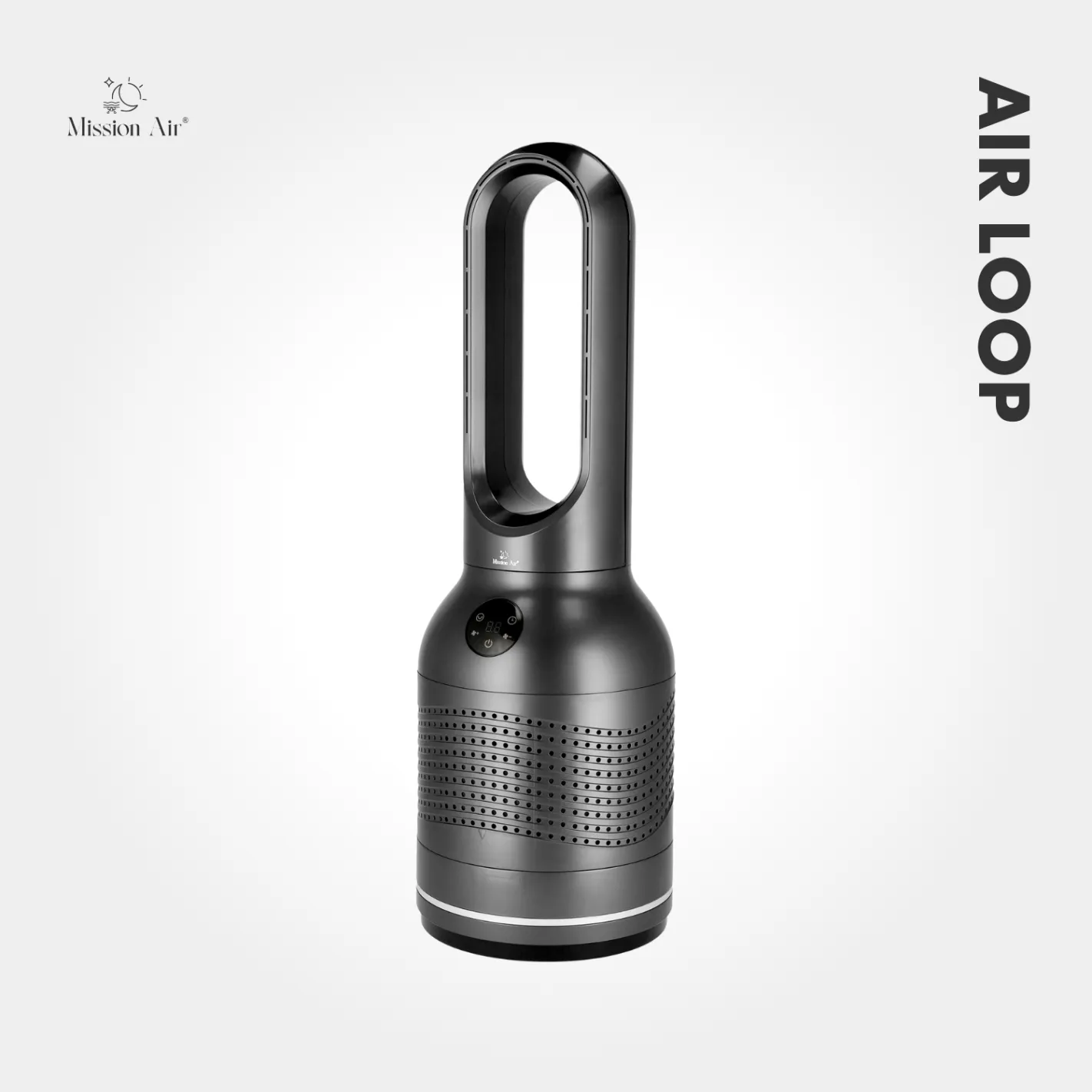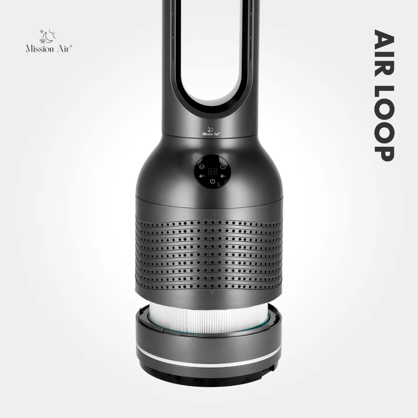 Cool air and clean air, together. The grey AirLoop combines bladeless airflow with a built-in HEPA filter that captures dust, pollen, and allergens — so every breath in the room is genuinely fresher.