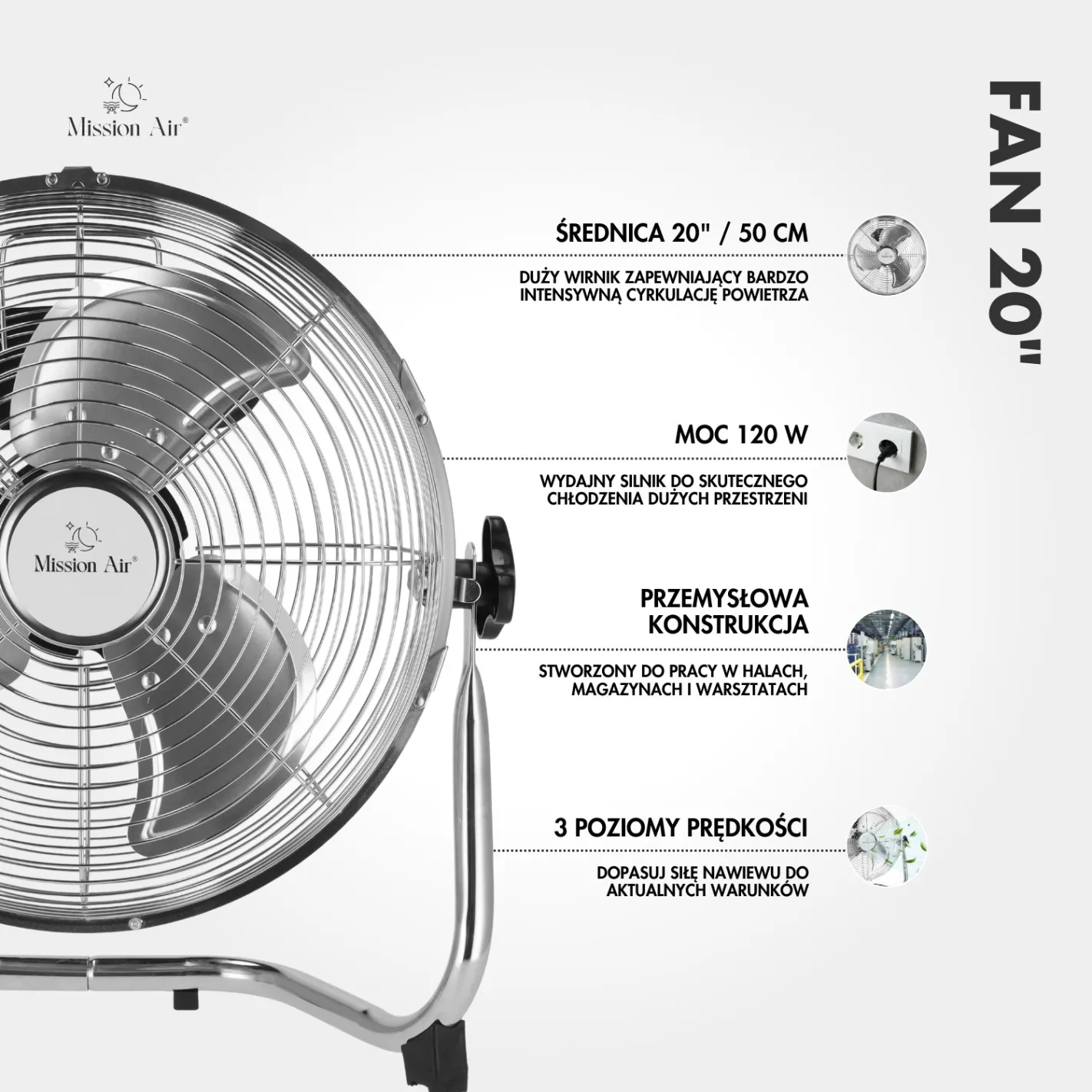 When the environment is demanding, the equipment needs to match. The Mission Air FAN 20" is a 50 cm, 120 W industrial fan built for continuous use in large halls, warehouses, workshops, and commercial premises — where airflow isn't a luxury, it's a necessity.