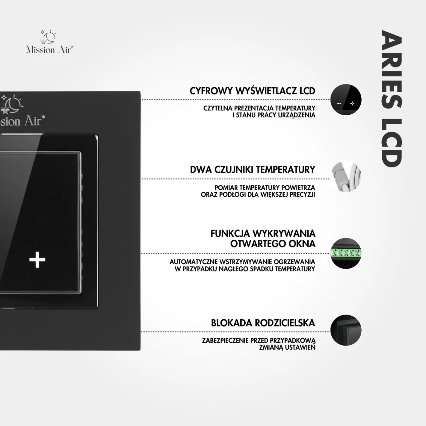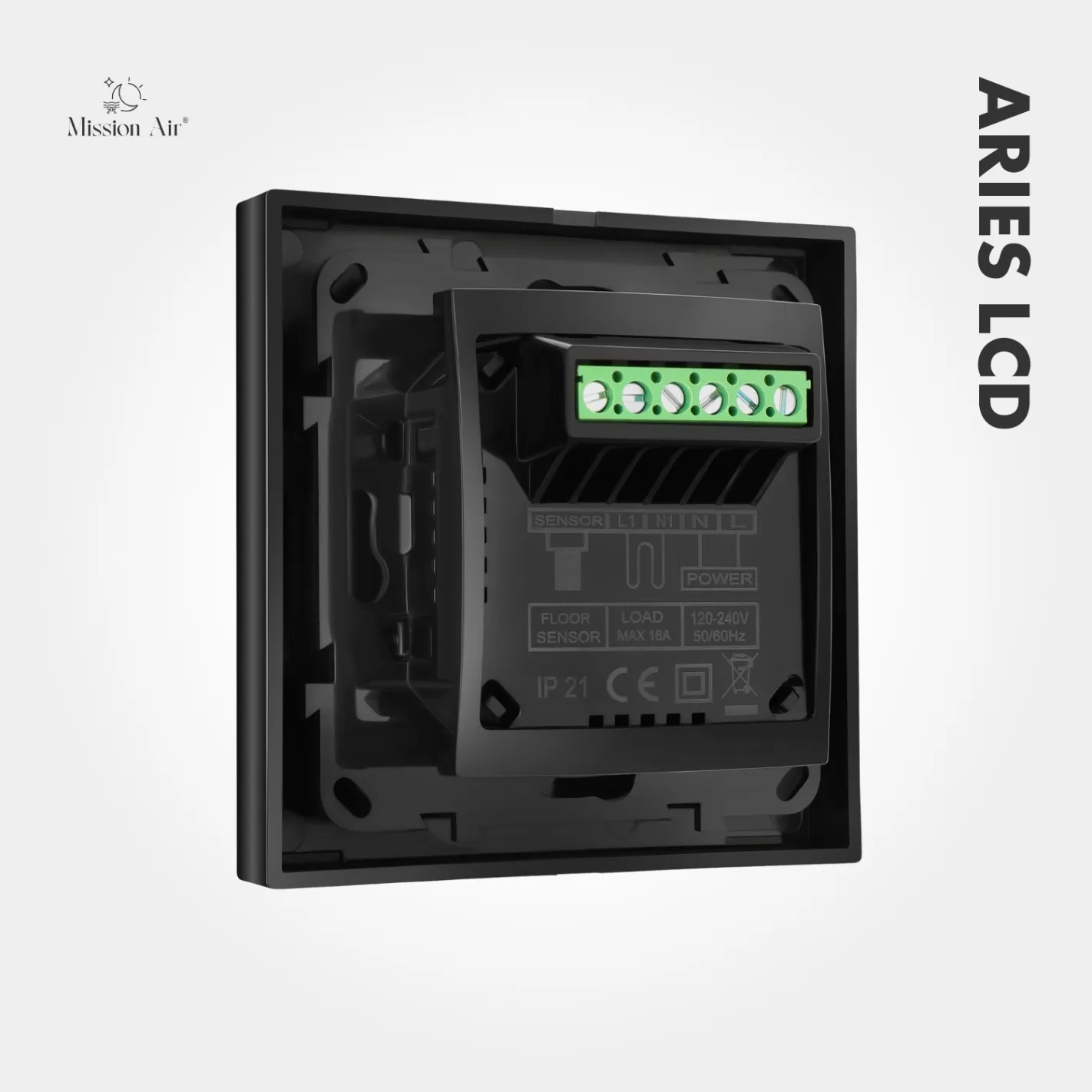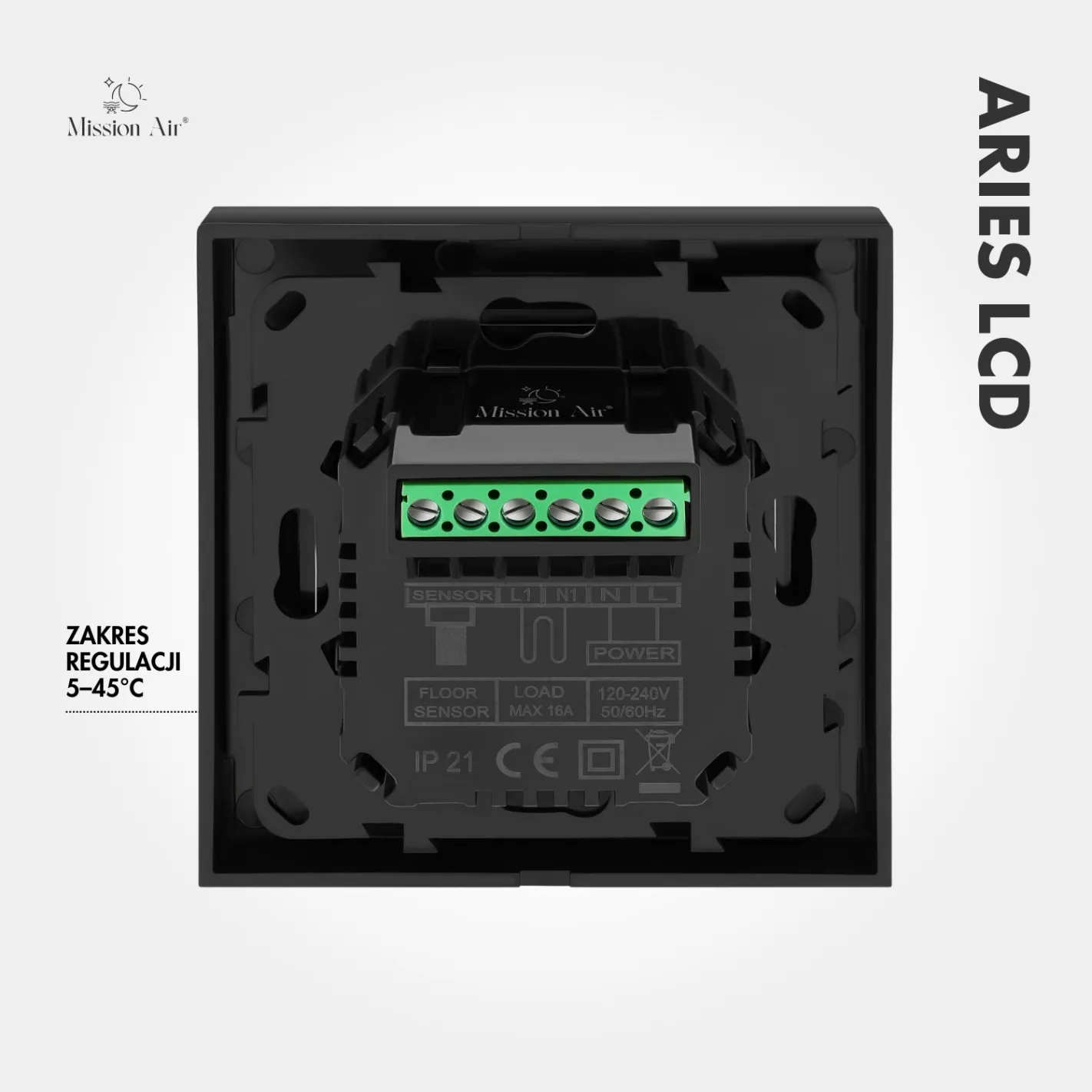 A backlit LCD display, reliable NTC sensor, and straightforward controls make the ARIES LCD in black exactly what a heating thermostat should be — accurate, easy to use, and built to last. Anti-frost protection looks after the installation when the heating is off, and compatibility with standard flush-mount back boxes means fitting it is quick and hassle-free.