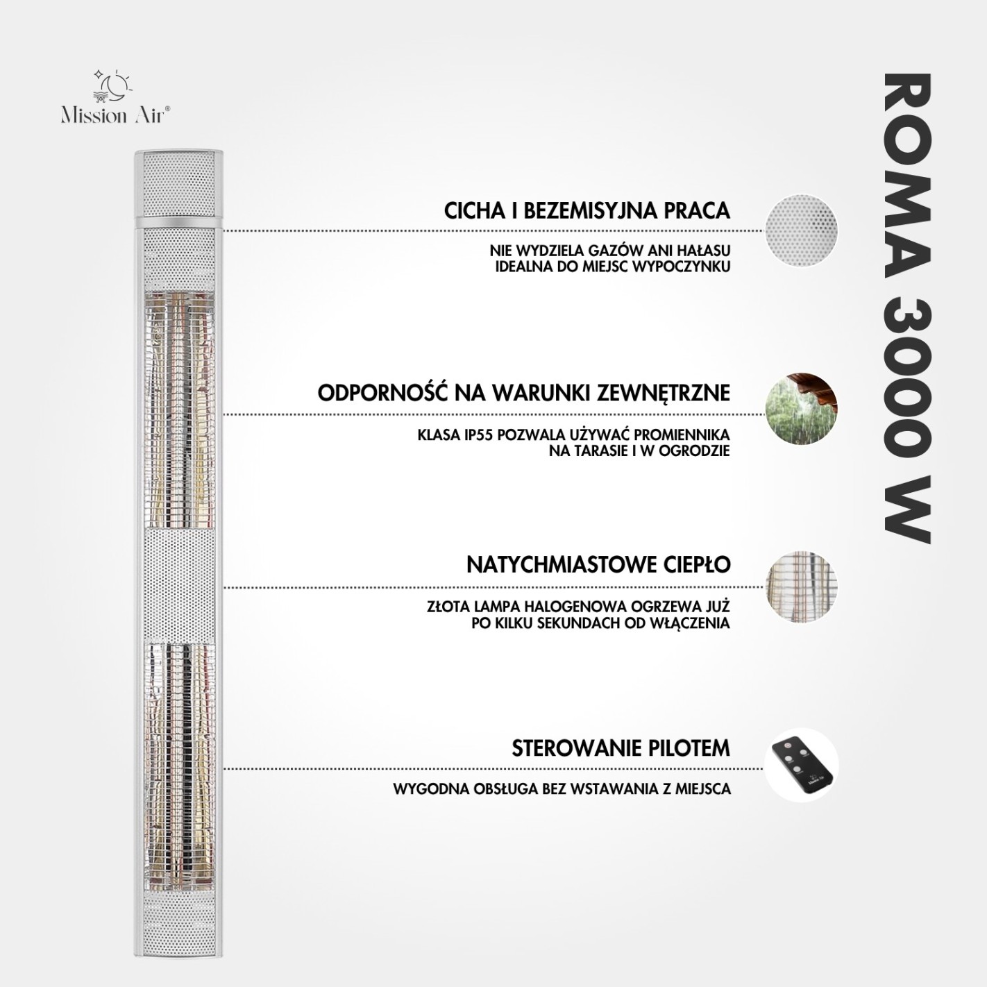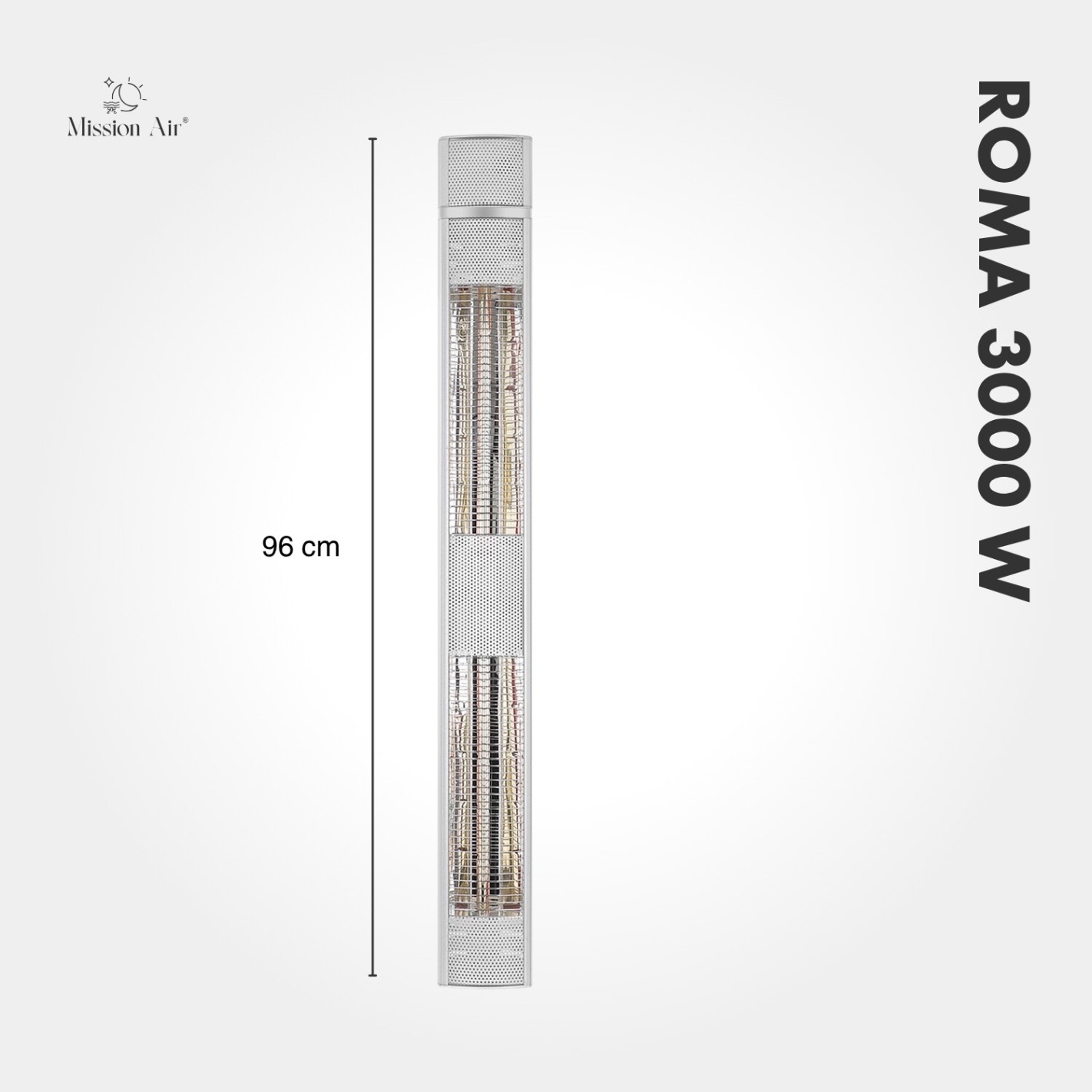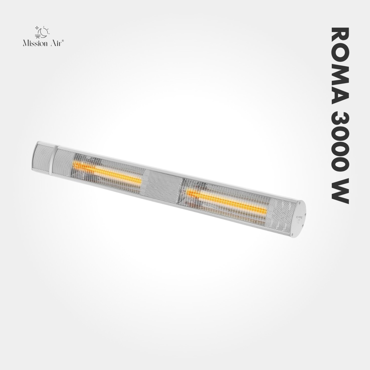 Three kilowatts of infrared heat, delivered instantly. The ROMA 3000 W is Mission Air's most powerful patio heater — built for larger terraces, winter gardens, and outdoor shelters where serious warmth is needed and the cold won't take no for an answer.
