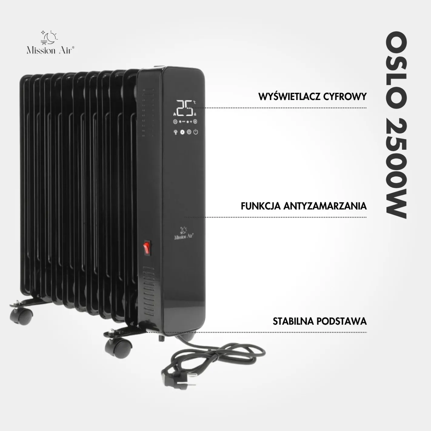 The most powerful model in the OSLO Black series, designed for large rooms and demanding heating needs. With 11 heating fins, it distributes warmth evenly, while oil-filled technology continues to release heat even after the unit is switched off. Built-in WiFi (Tuya), a touch control panel, and remote control provide full command — from selecting operating modes to setting schedules and timers. Comfort, Eco, and Anti-Frost modes make it easy to manage heating efficiently and reduce energy use.
