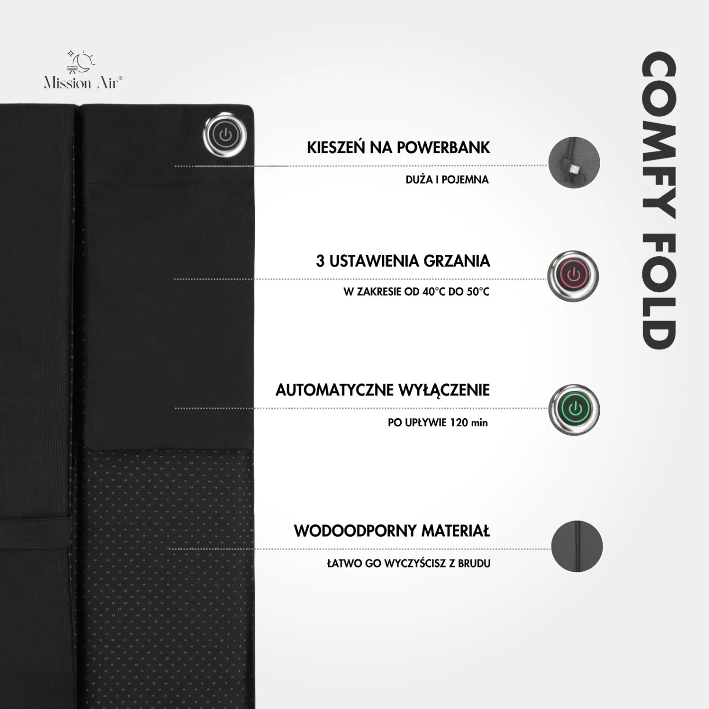 USB-powered, so you can use it in the office, at home, or on the move. A built-in powerbank pocket keeps cables and the power source neatly tucked away, and automatic shut-off after 120 minutes adds safety and convenience.