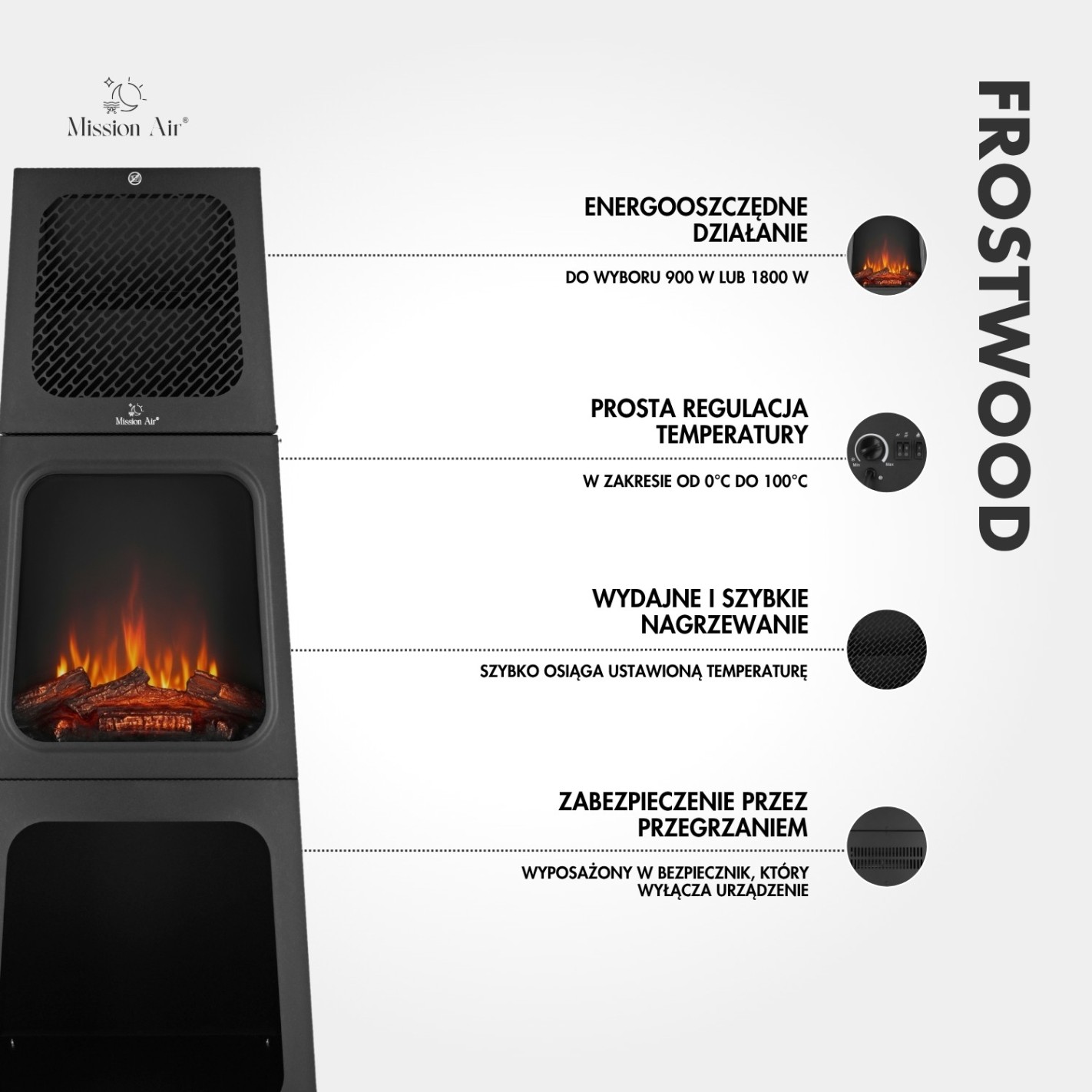Operation is simple and intuitive, and overheat protection ensures safe use throughout. The FROSTWOOD 1800W isn't just a source of pleasant warmth — it's an elegant feature that brings a cosy atmosphere to any home.
