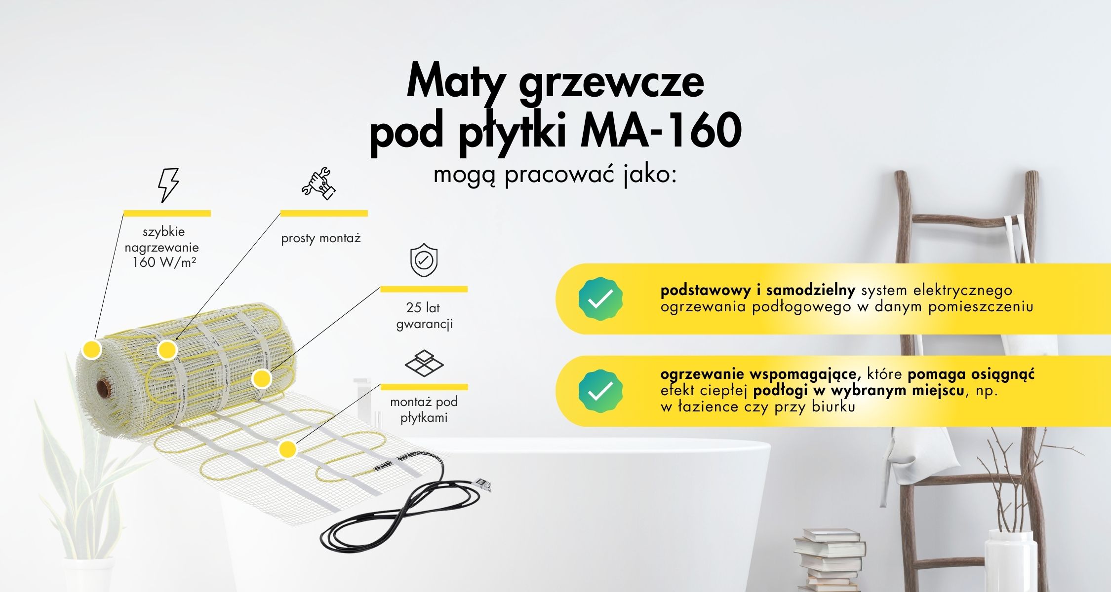 Z kolei przy panelach laminowanych, podłogach winylowych czy drewnianych, zalecana jest mata MAL-160, również od Mission Air. Choć posiada taką samą moc grzewczą jak MA-160 (160 W/m²), jej konstrukcja została dostosowana do montażu pod wrażliwymi materiałami. Przy jej instalacji niezbędne jest użycie czujnika temperatury podłogi i ustawienie ograniczenia temperatury, by zapobiec przegrzewaniu i uszkodzeniom powierzchni.