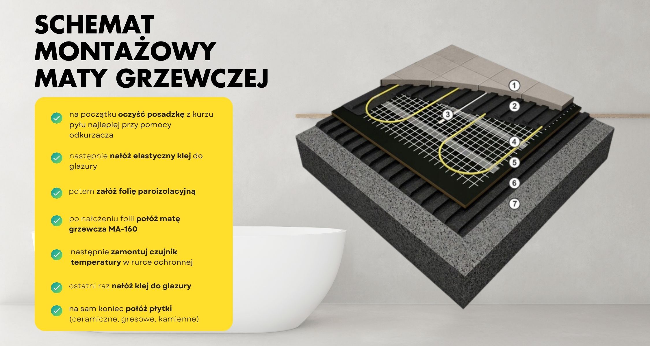 Upewnij się, że podłoże jest suche, czyste, równe i pozbawione wszelkich zanieczyszczeń, takich jak kurz, tłuszcz czy resztki innych materiałów budowlanych. Dokładne przygotowanie powierzchni ma kluczowe znaczenie, ponieważ na idealnie wygładzonej i oczyszczonej powierzchni mata grzewcza przylega równomiernie, co bezpośrednio wpływa na jej efektywność i trwałość. Pamiętaj również, aby przed montażem upewnić się, że powierzchnia jest odpowiednio zagruntowana, co dodatkowo poprawi przyczepność maty do podłoża.
