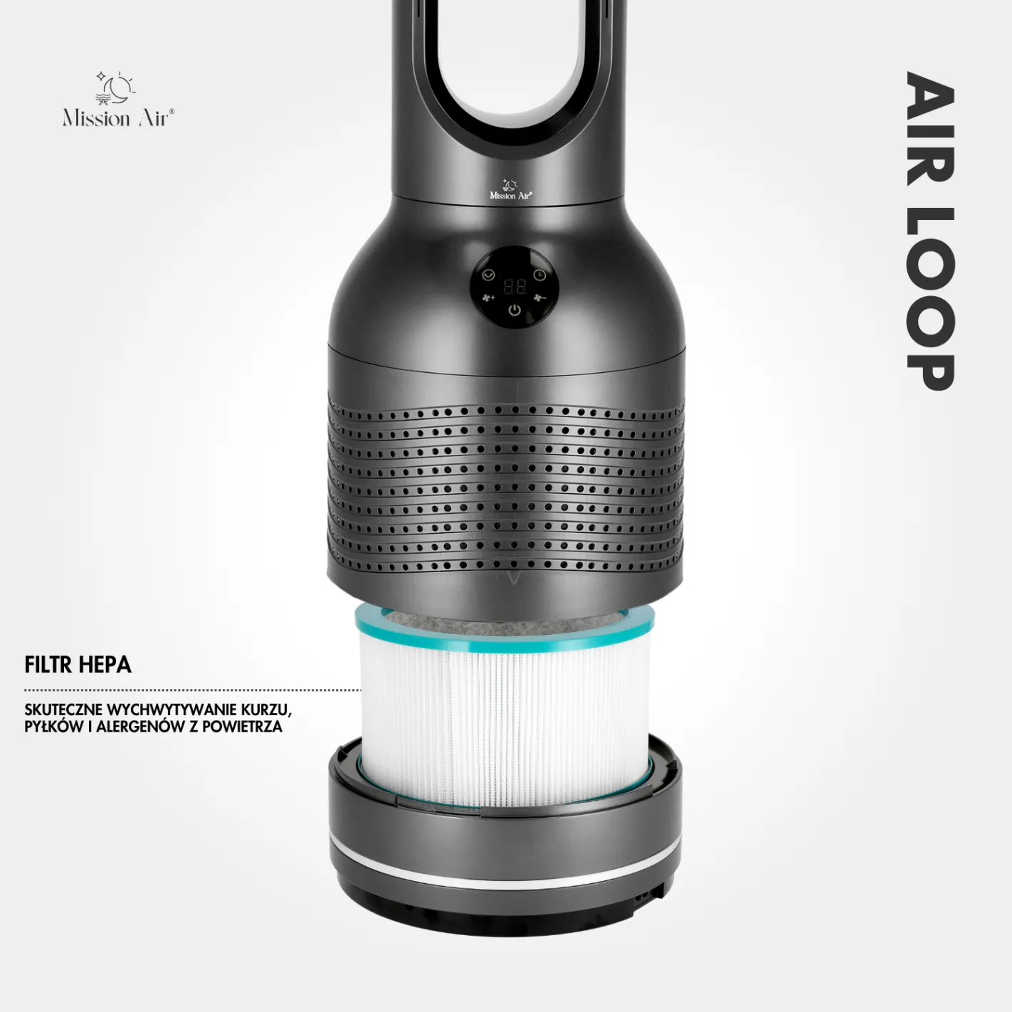 AirLoop w kolorze szarym to bezłopatkowy wentylator premium, który łączy funkcję chłodzenia z oczyszczaniem powietrza. Wbudowany filtr HEPA zatrzymuje kurz, pyłki i alergeny.