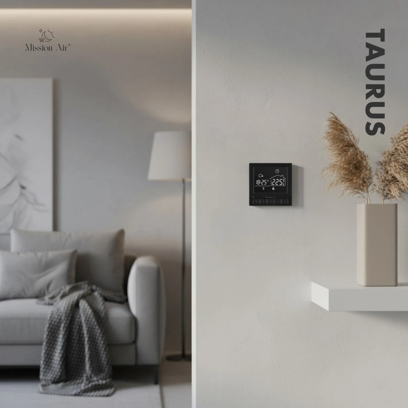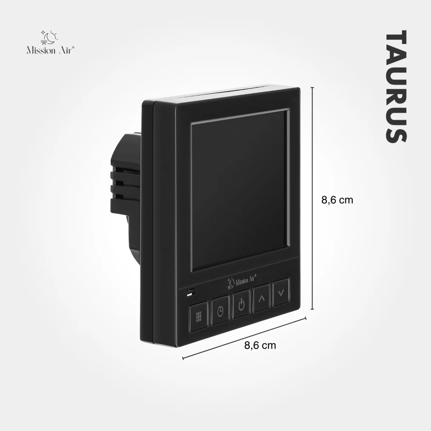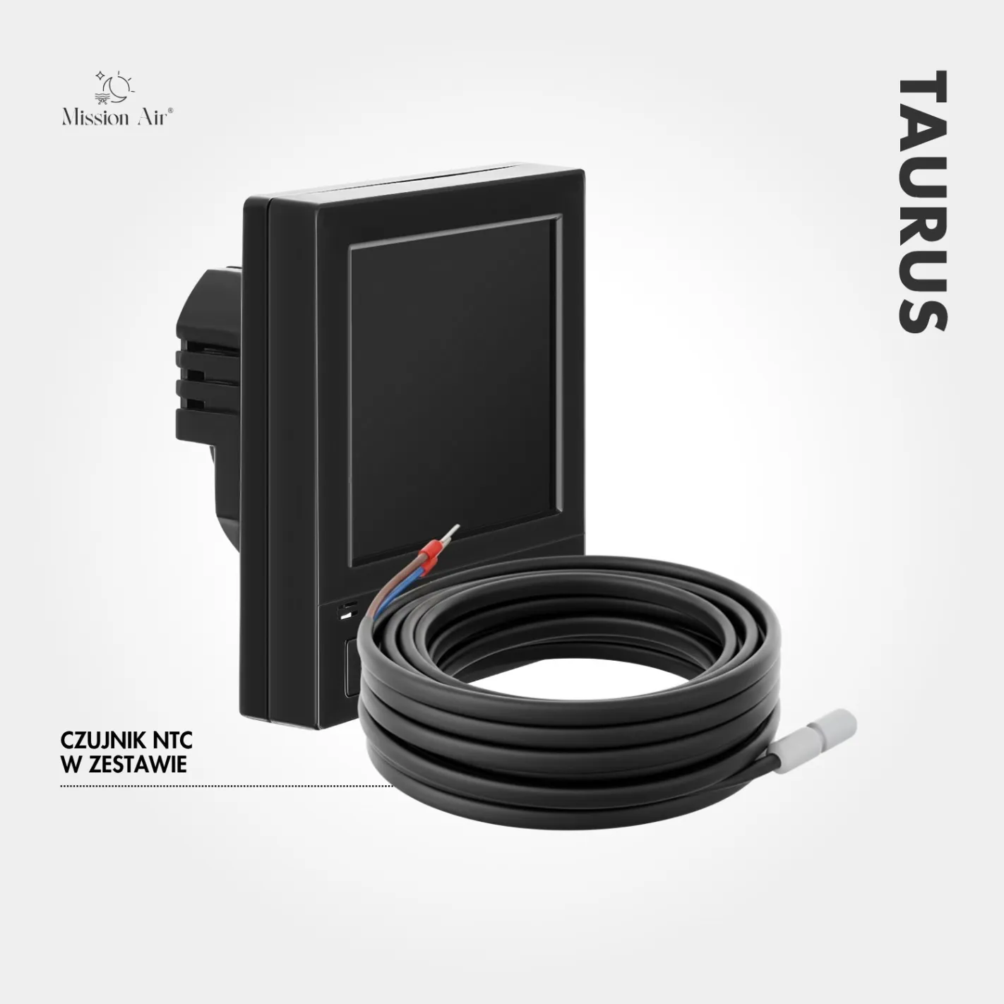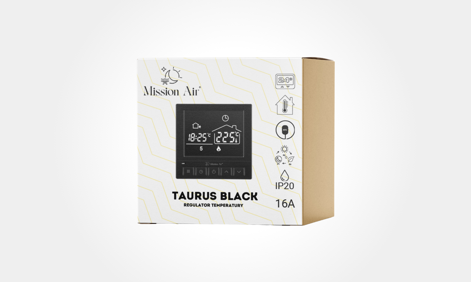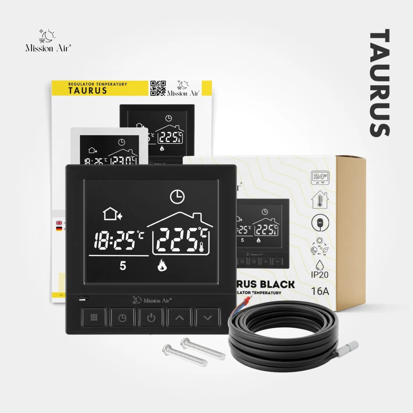 TAURUS w eleganckiej czerni to idealne rozwiązanie do kontroli mat i folii grzewczych. Oferuje tygodniowe programowanie z sześcioma cyklami na każdy dzień, co pozwala zoptymalizować zużycie energii i cieszyć się komfortem wtedy, gdy jest potrzebny.