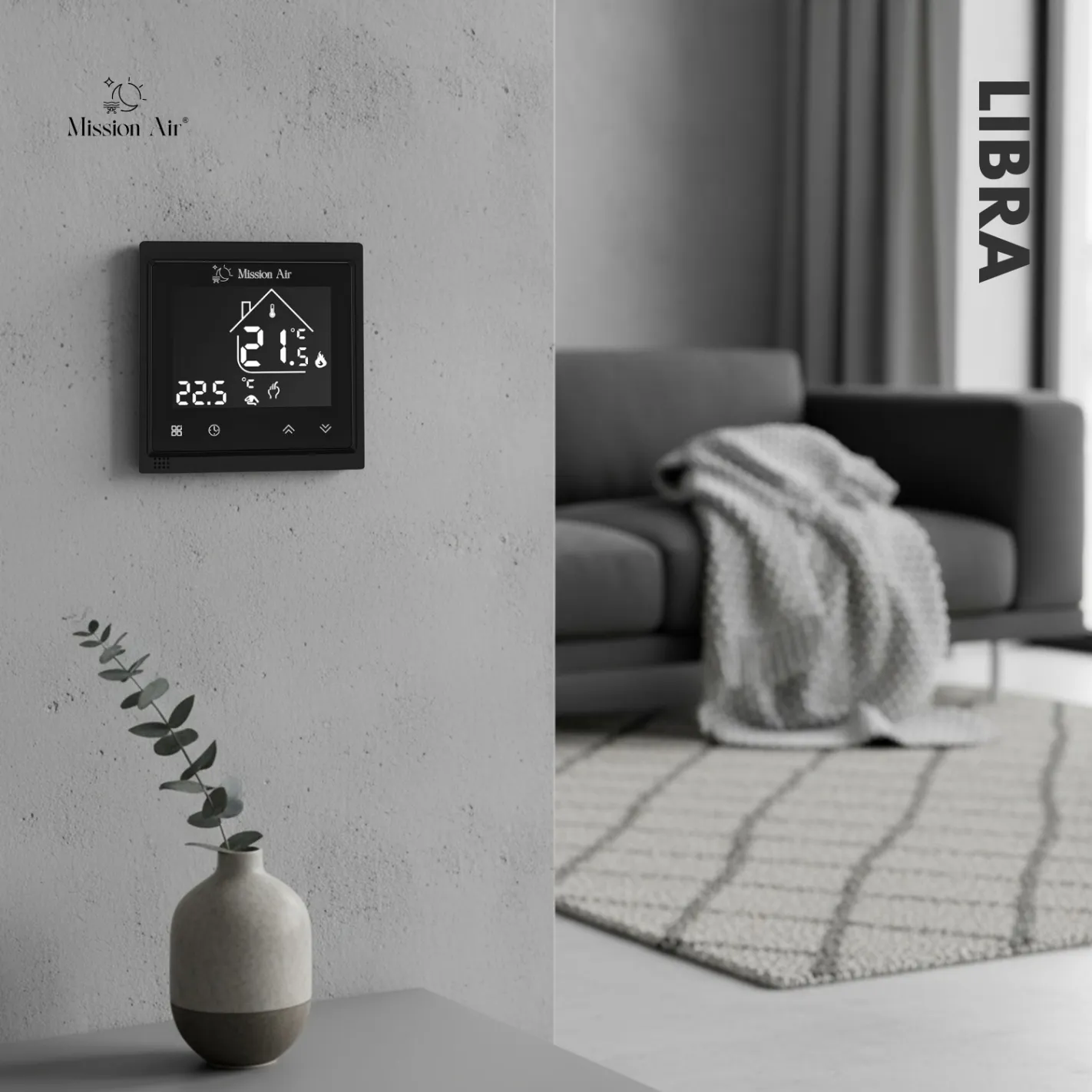 LIBRA w czarnej odsłonie to elegancki i inteligentny regulator ogrzewania podłogowego. Łączność WiFi umożliwia obsługę przez aplikacje mobilne, a integracja z Google Home i Alexa daje swobodę sterowania głosem.