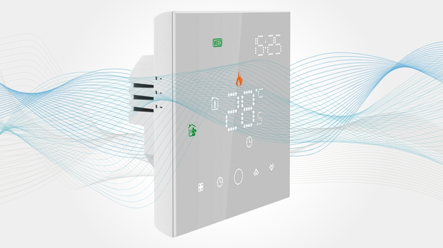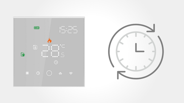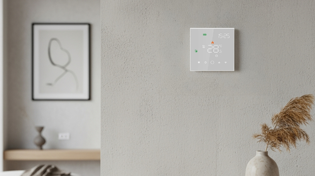 LEO w bieli to stylowy regulator z eleganckim, szklanym panelem dotykowym. Dzięki łączności WiFi możesz sterować ogrzewaniem podłogowym z dowolnego miejsca przez aplikacje Tuya Smart lub Smart Life.