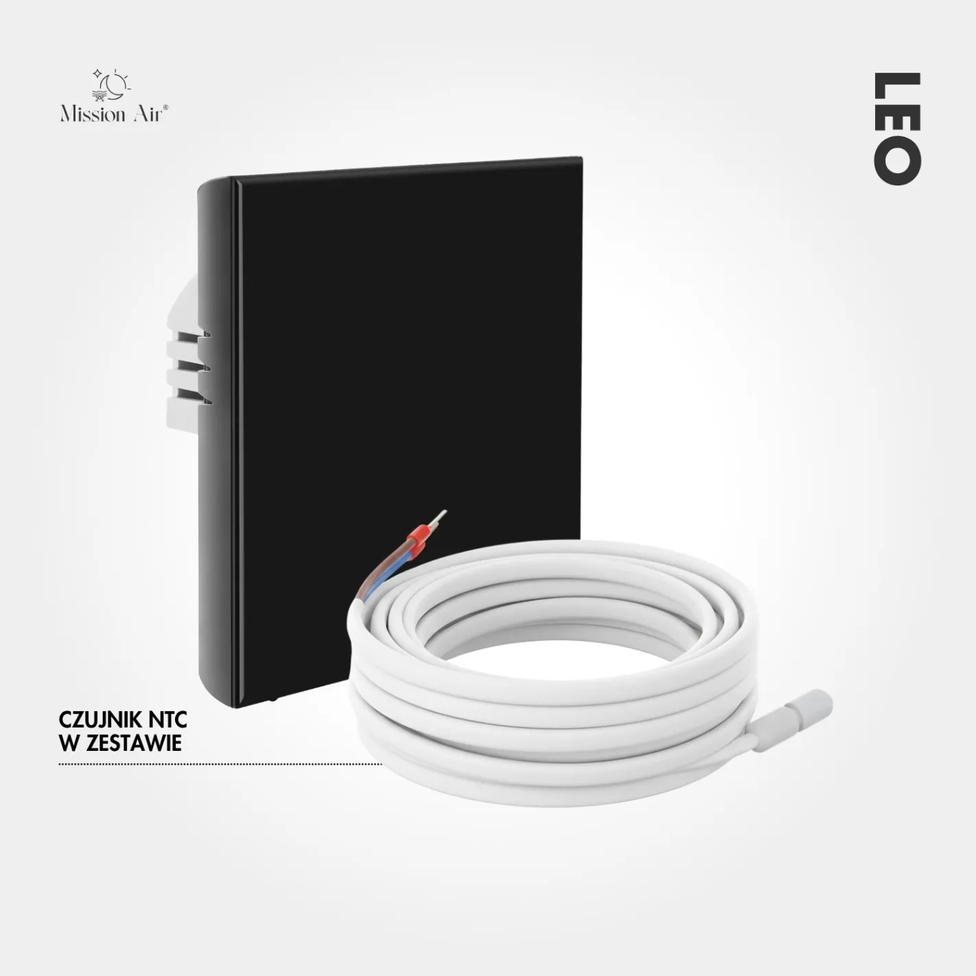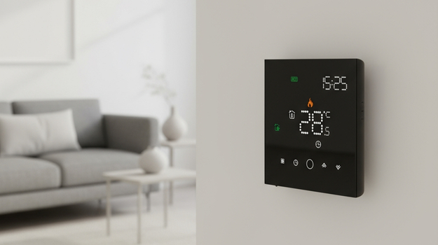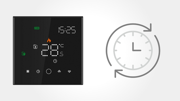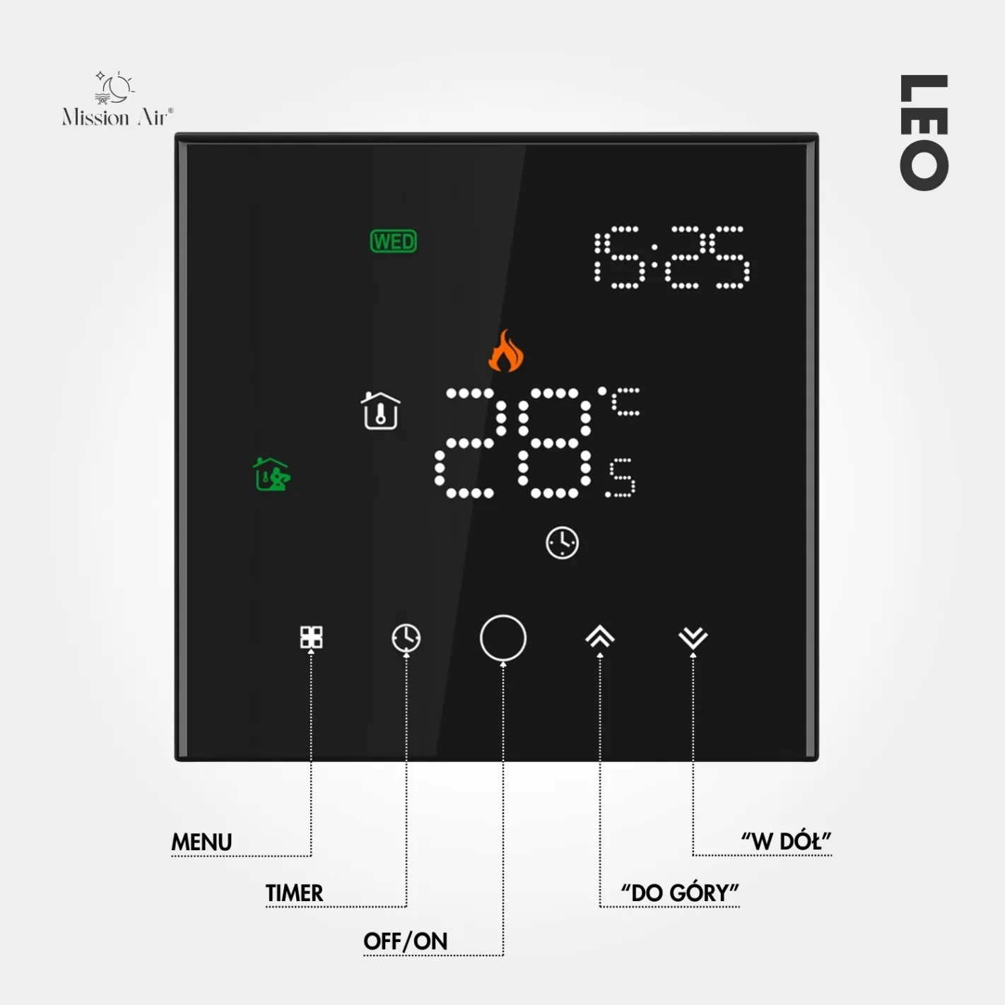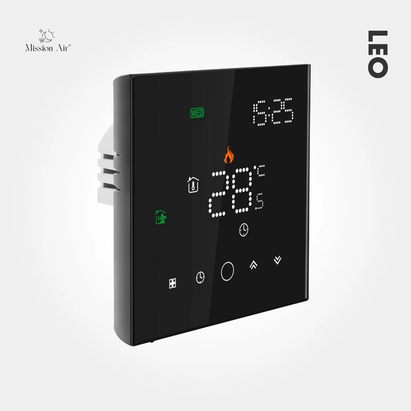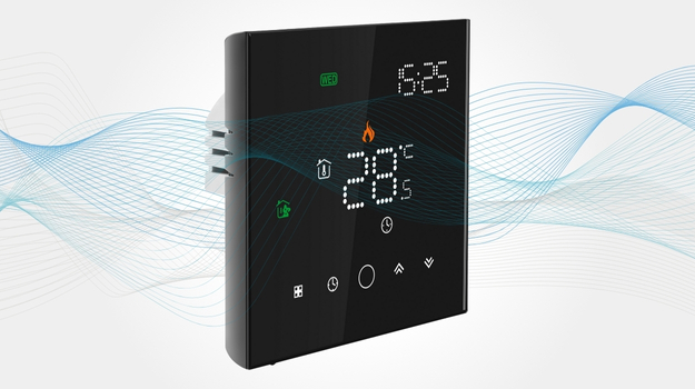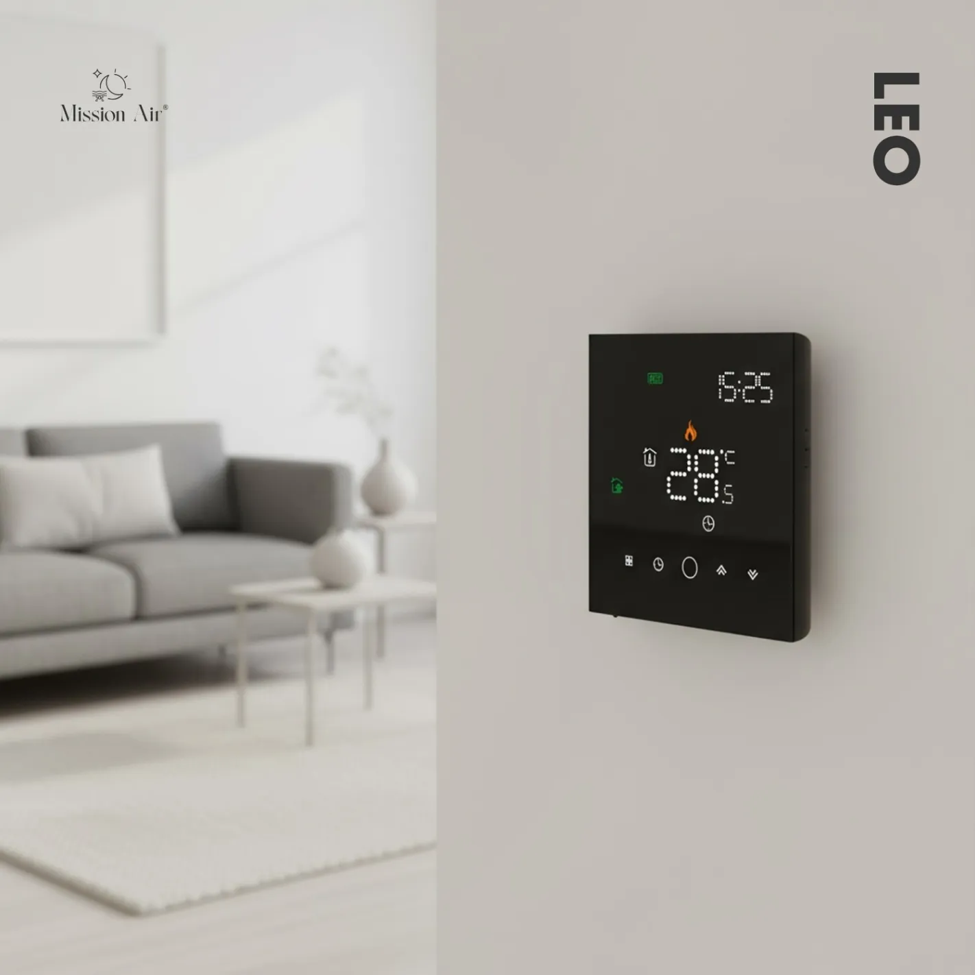 LEO w czarnej wersji to elegancki, dotykowy regulator temperatury z funkcją WiFi. Pozwala sterować ogrzewaniem podłogowym przez aplikacje Tuya Smart i Smart Life, a także komendy głosowe Google Home i Alexa.