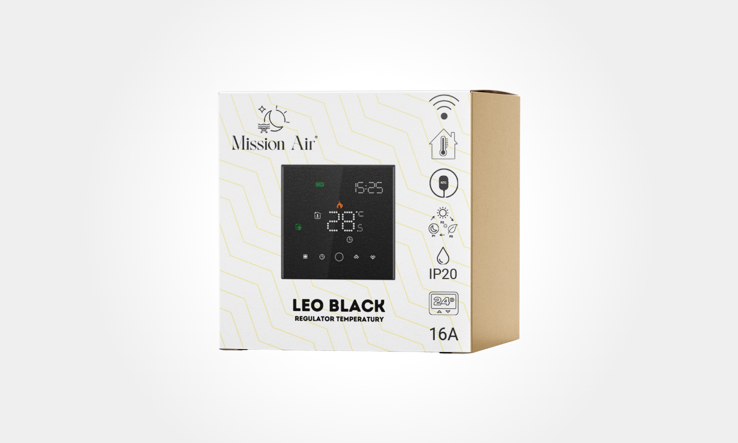 Regulator oferuje programowanie tygodniowe, możliwość ustawienia sześciu cykli dziennie oraz tryb przeciwzamrożeniowy. Czujnik powietrza i podłogowy NTC zapewniają precyzyjne pomiary i stabilną pracę systemu.