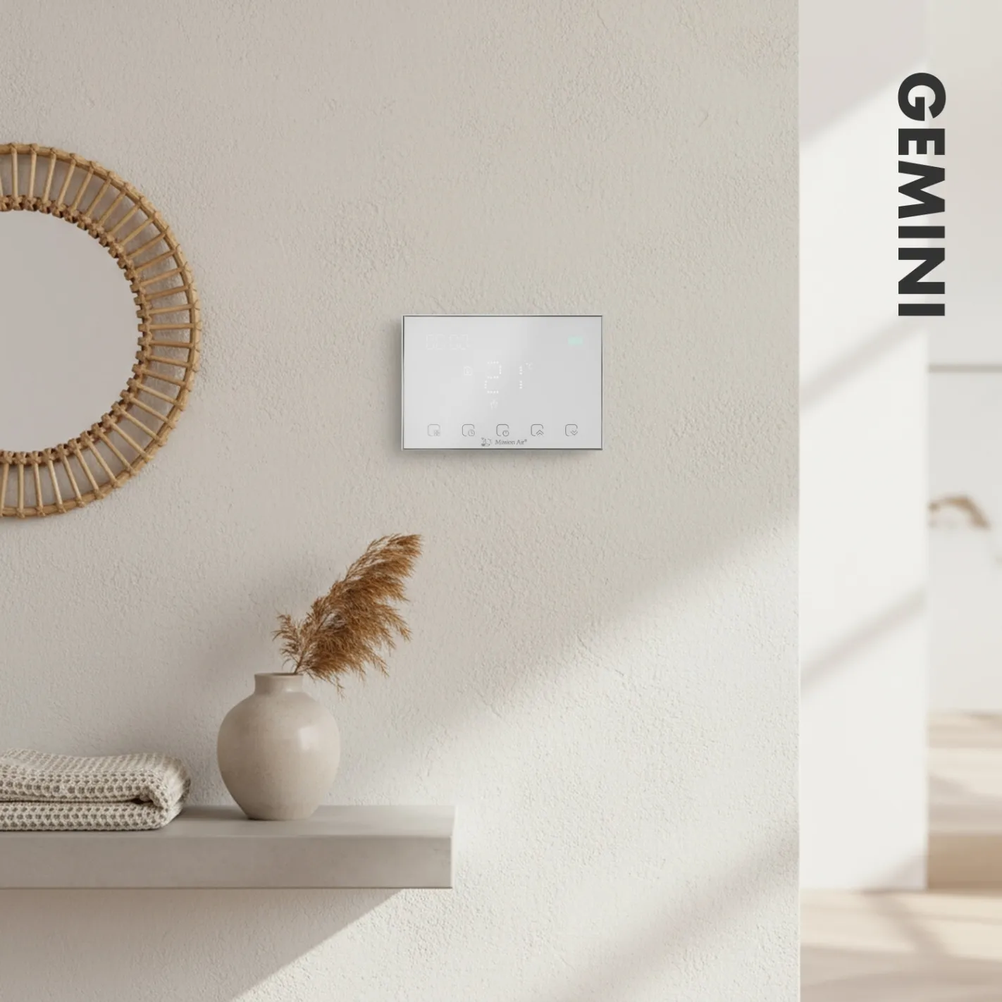 GEMINI WiFi w bieli to innowacyjny regulator temperatury działający w technologii radiowej. Dzięki łączności WiFi i integracji z aplikacjami Tuya Smart oraz Smart Life umożliwia sterowanie ogrzewaniem z telefonu i tabletu.