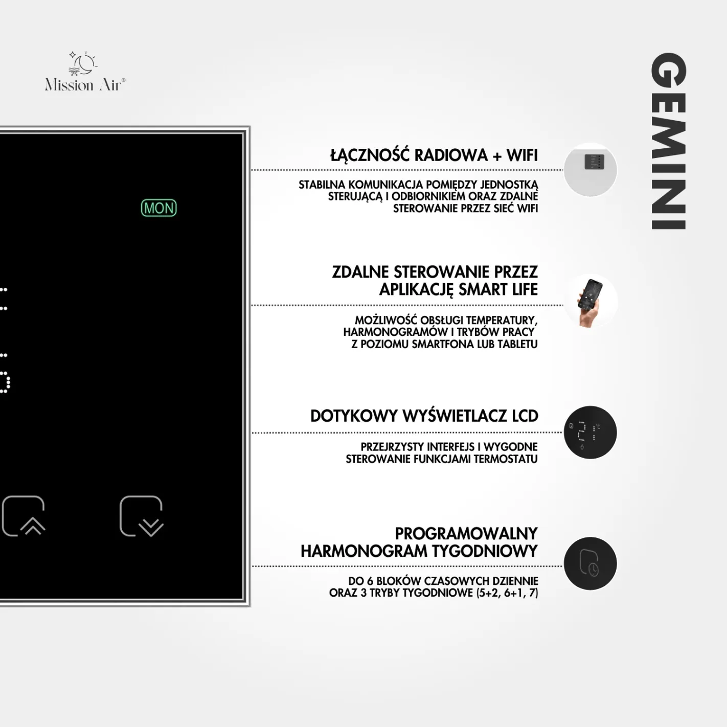GEMINI WiFi to elegancki regulator radiowy, który pozwala zarządzać ogrzewaniem z dowolnego miejsca. Dzięki aplikacjom mobilnym i wsparciu dla Google Home oraz Alexa, obsługa jest wygodna i nowoczesna.