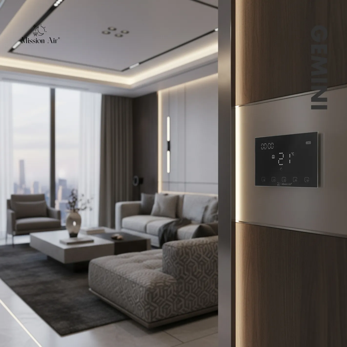 Stylowa czarna obudowa ze szklanym panelem podkreśla nowoczesny charakter wnętrza, a solidna konstrukcja Mission Air gwarantuje niezawodność i bezpieczeństwo.
