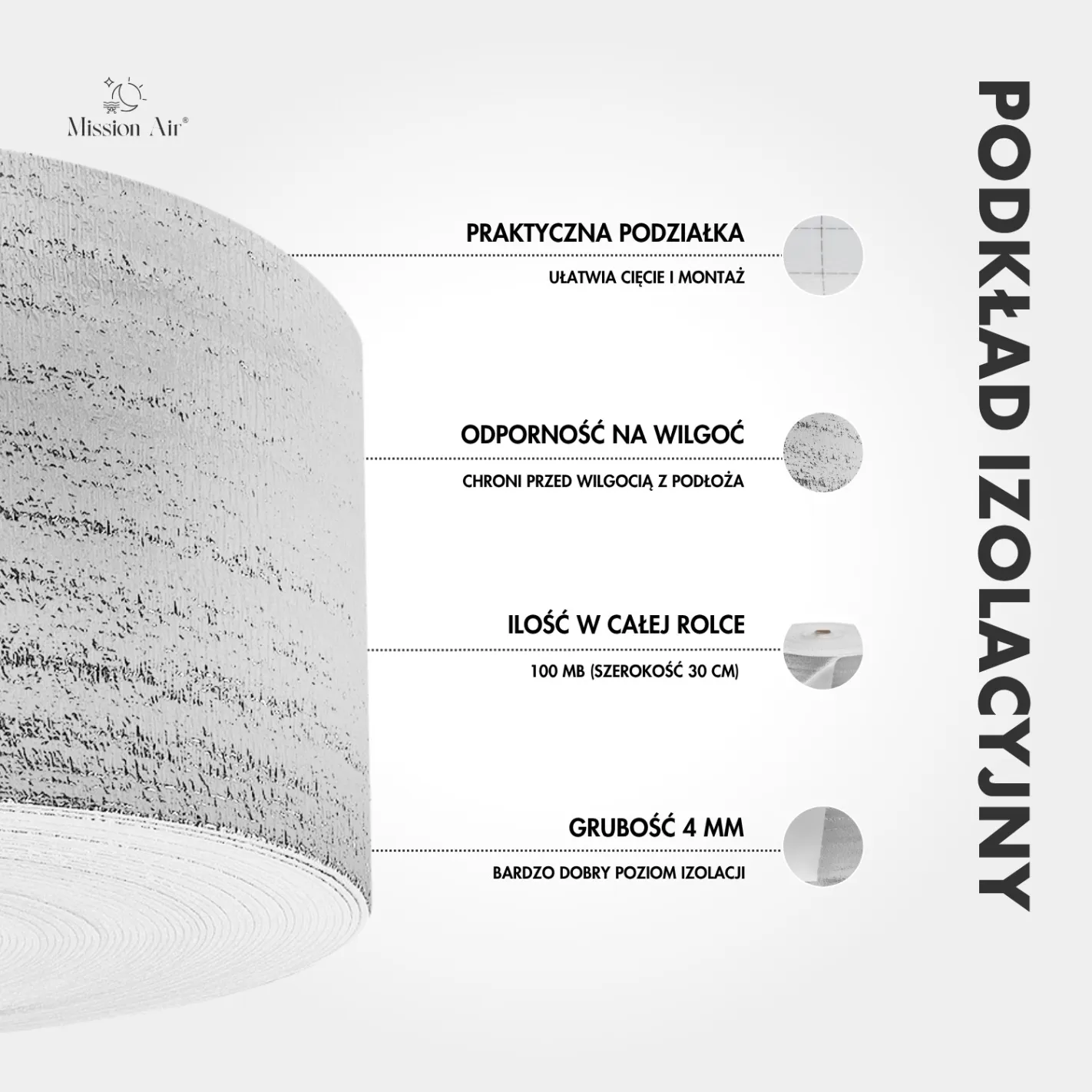 Duża rolka umożliwia szybki montaż na większych powierzchniach – świetnie sprawdzi się w domach, mieszkaniach i biurach. Podkład pełni również funkcję izolacji przed wilgocią i poprawia akustykę pomieszczeń.