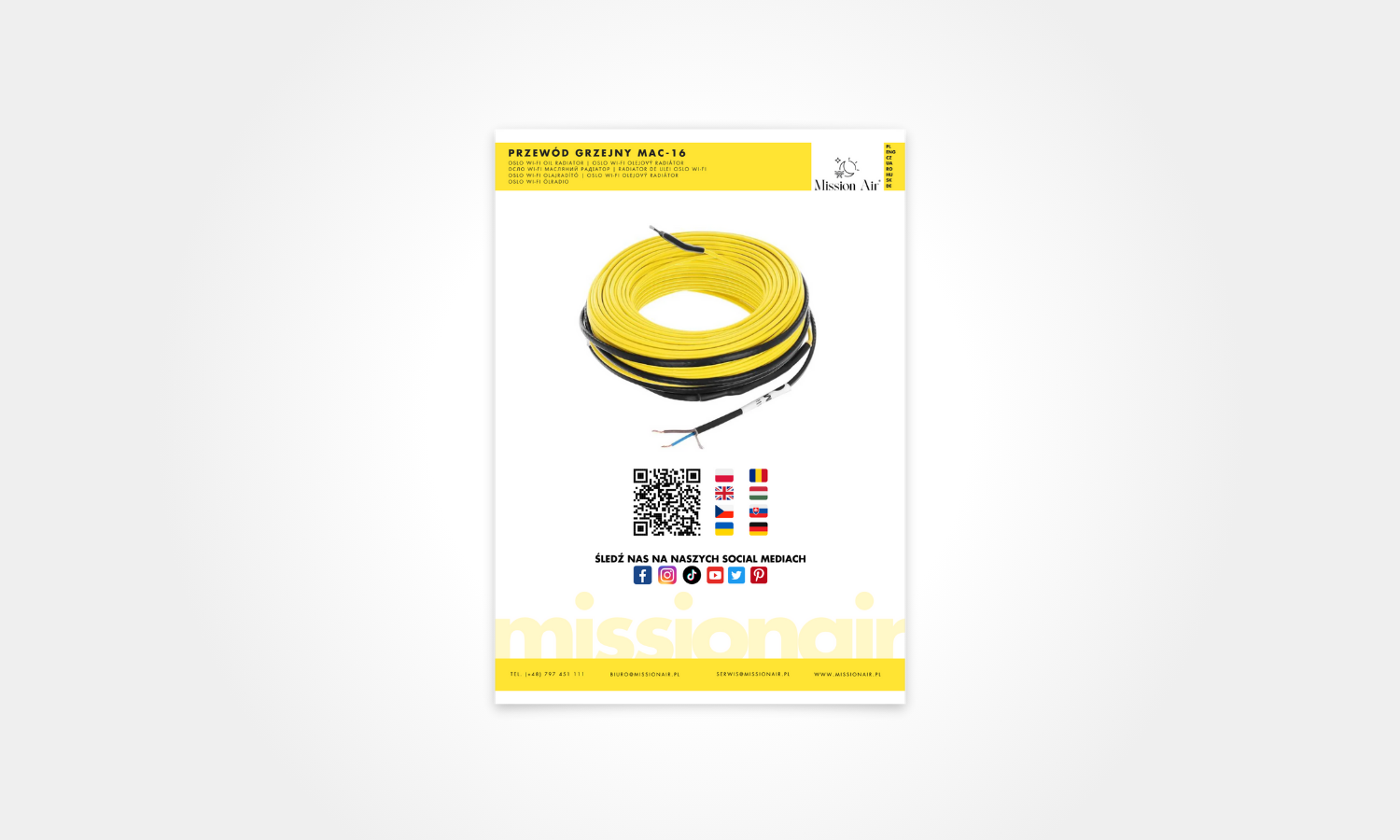 Przewód grzewczy Mission Air MAC-16 to niezawodne rozwiązanie do ochrony rur wodnych i instalacji przed zamarzaniem. Dzięki mocy 16 W/mb zapewnia równomierne i skuteczne ogrzewanie, a jego elastyczna konstrukcja pozwala dopasować długość od 7,5 do 154 m.