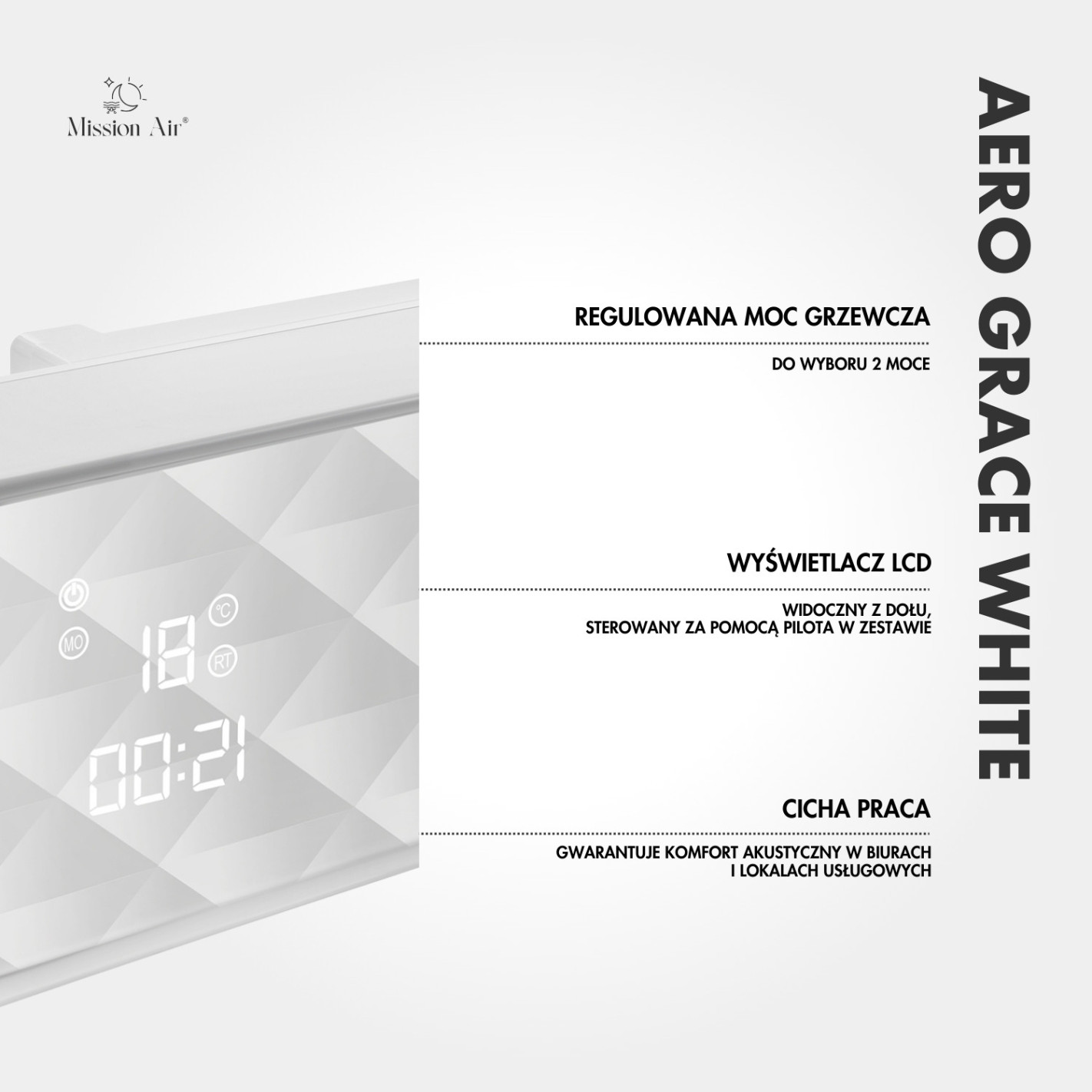 AERO Grace 2000 W to funkcjonalny sposób na stabilny komfort termiczny — idealny do mieszkań, biur, sklepów i miejsc, w których liczy się ograniczenie strat ciepła.