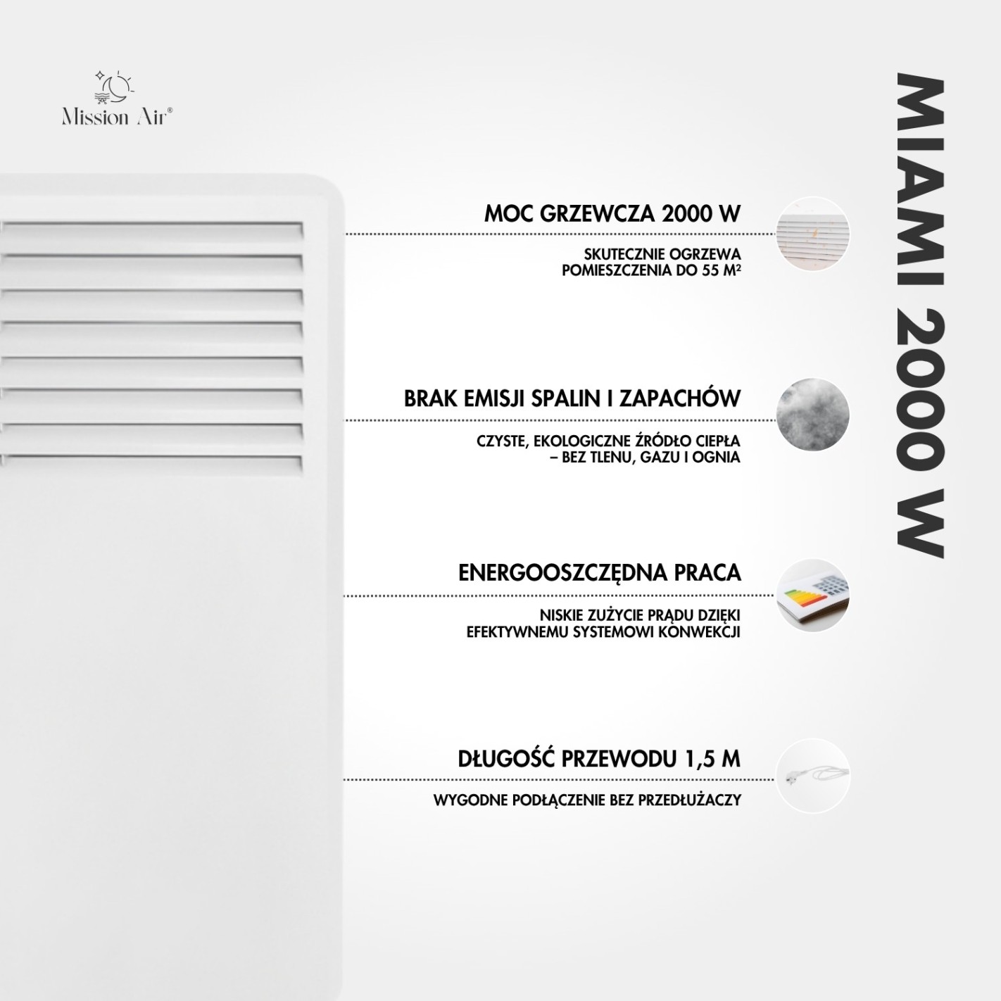 Grzejnik konwektorowy MIAMI 2000 W | Elektryczny, Biały