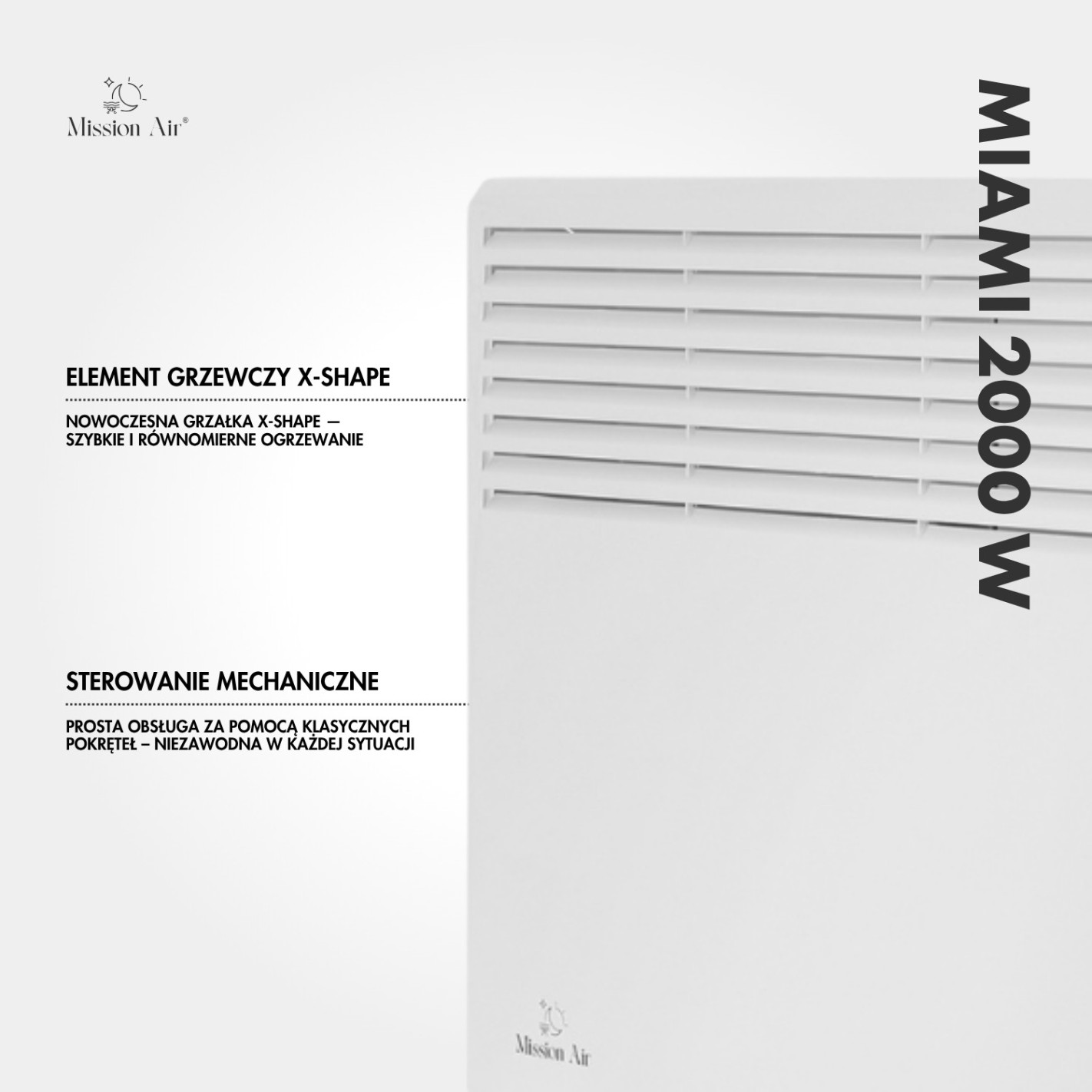 Miami 2000 W to nowoczesny grzejnik konwektorowy stworzony z myślą o większych pomieszczeniach. Minimalistyczna, biała konstrukcja wpisuje się w estetykę współczesnych wnętrz, zapewniając mocne i równomierne źródło ciepła.