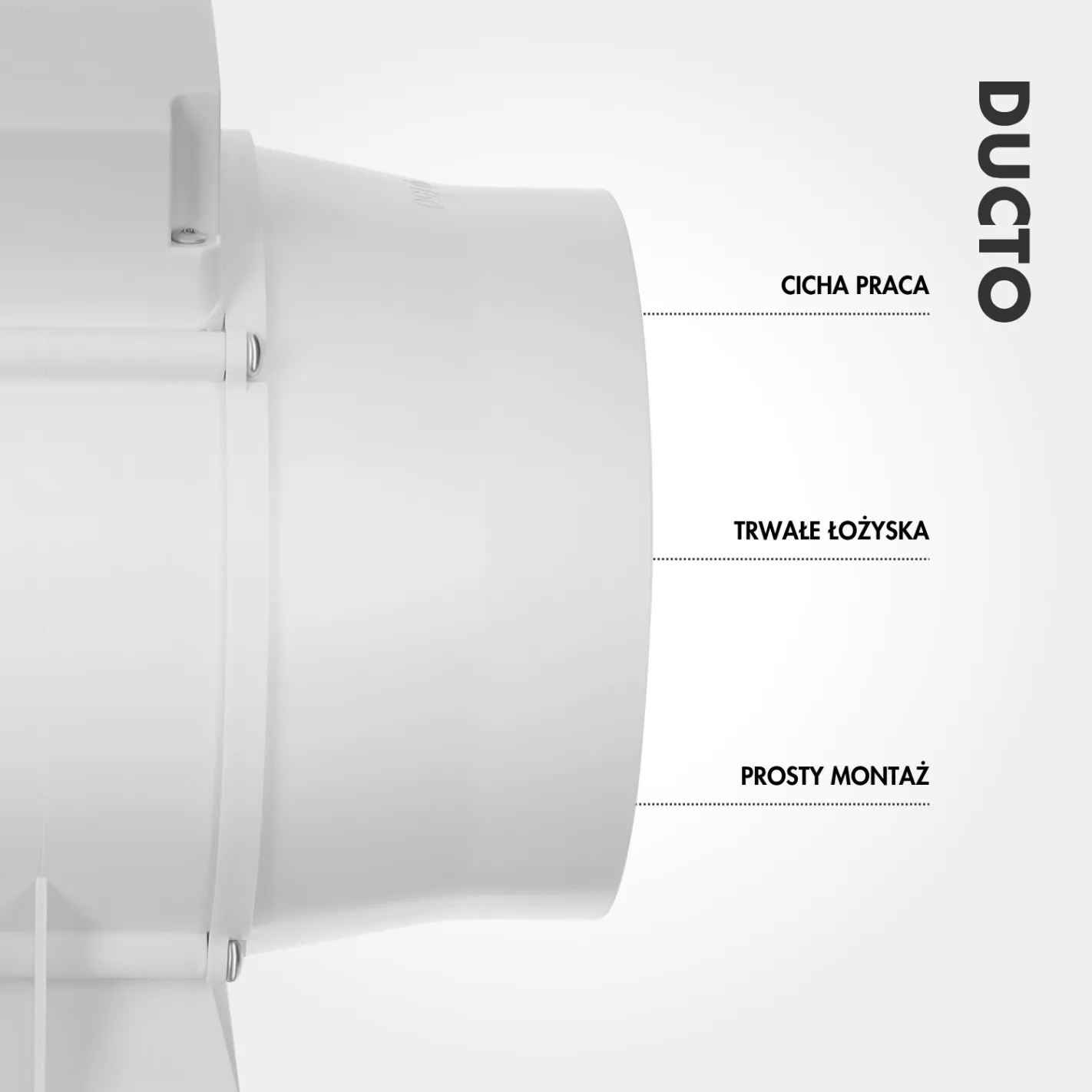 DUCTO 150 w kolorze białym to wydajny wentylator kanałowy zaprojektowany do skutecznej wymiany powietrza w pomieszczeniach mieszkalnych i użytkowych. Jego kompaktowa konstrukcja umożliwia montaż w kanałach wentylacyjnych o średnicy 100 mm, zapewniając stały przepływ powietrza.